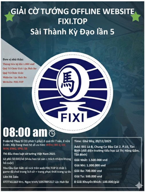 Xem thêmGIẢI CỜ TƯỚNG OFFLINE FIXI.TOP SÀI THÀNH KỲ ĐẠO LẦN 5
